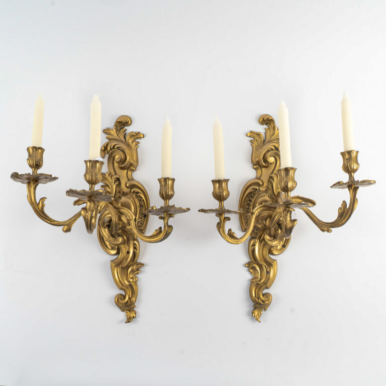 Paire d’appliques à trois lumières de style Louis XV Rocaille en bronze à patine doré, vers 1900