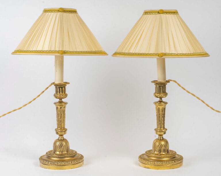 Paire de Flambeaux Montée en Lampes en Bronze Ciselé et Doré d’époque Louis XV vers 1750