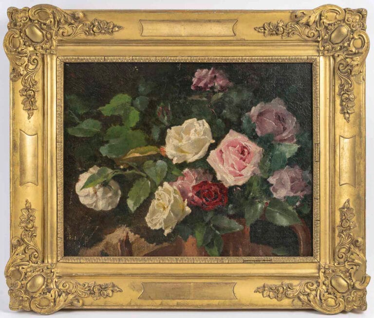 Nature morte au bouquet de Roses huile sur toile de la fin du XIXe siècle Description : Cette décorative huile sur toile, représentative nature morte de