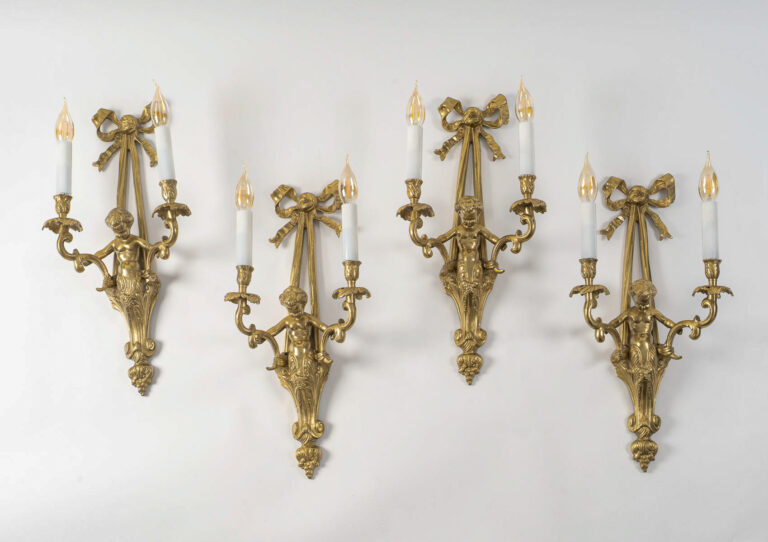 Set of Four Transition-Style Putti Wall Sconces in Chiseled and Gilt Bronze, c. 1880