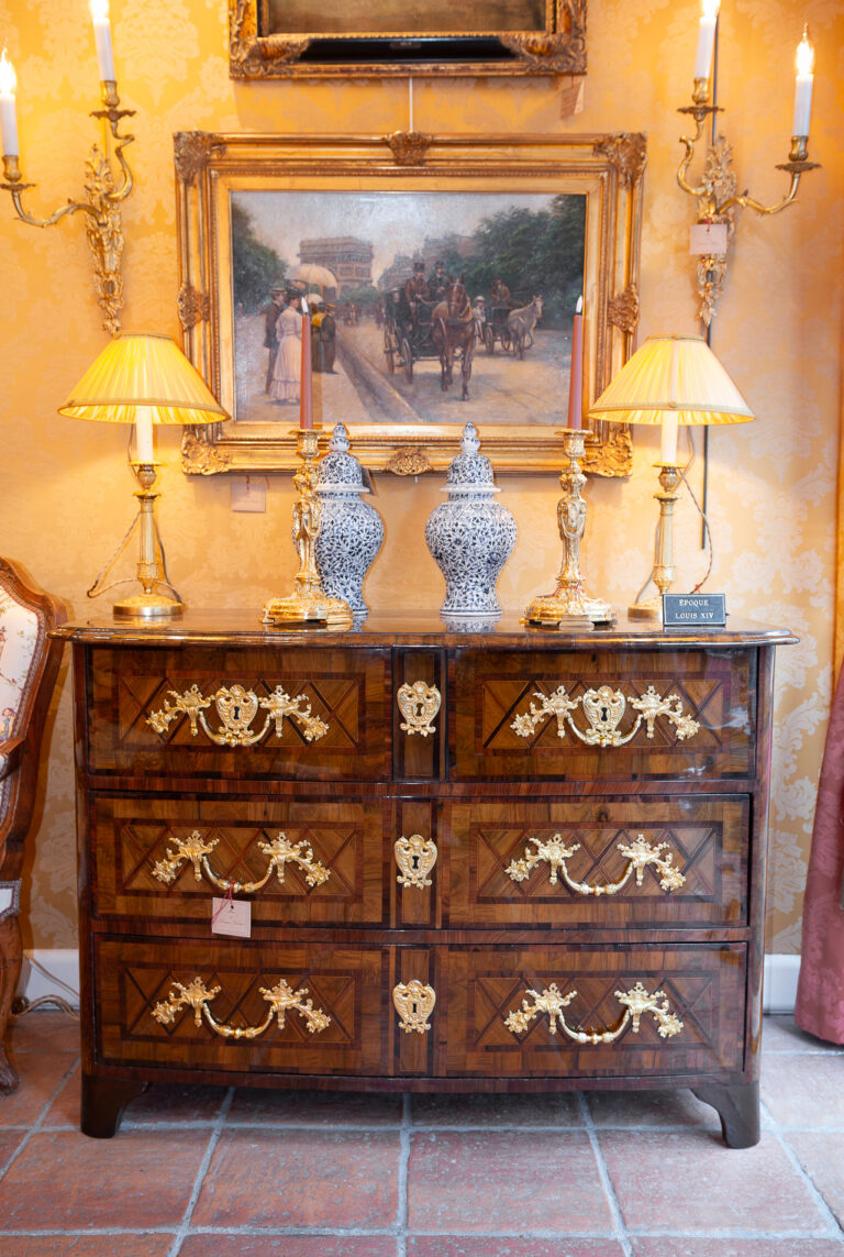 Dauphiné époque Louis XIV Commode à Marqueterie Géométrique Vers 1700 Découvrez cette élégante commode d’époque Louis XIV, légèrement bombée en façade, ouvrant