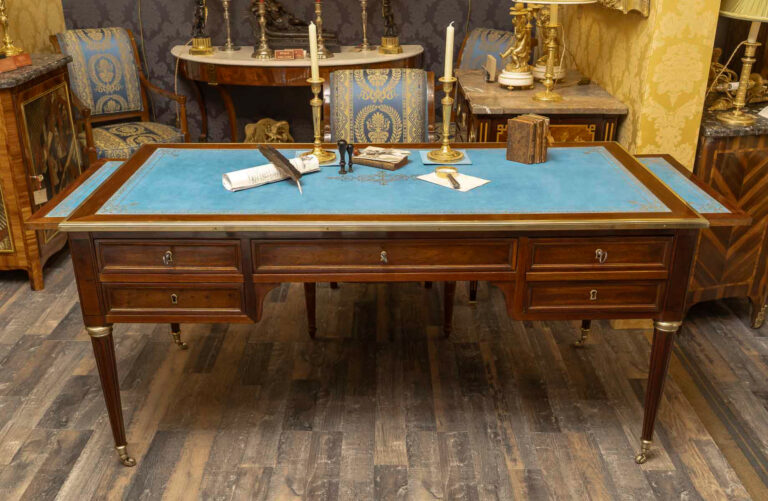 Bureau plat en acajou et décor de bronzes doré d’époque Louis XVI vers 1780-1790 Important bureau plat en acajou, placage d’acajou et