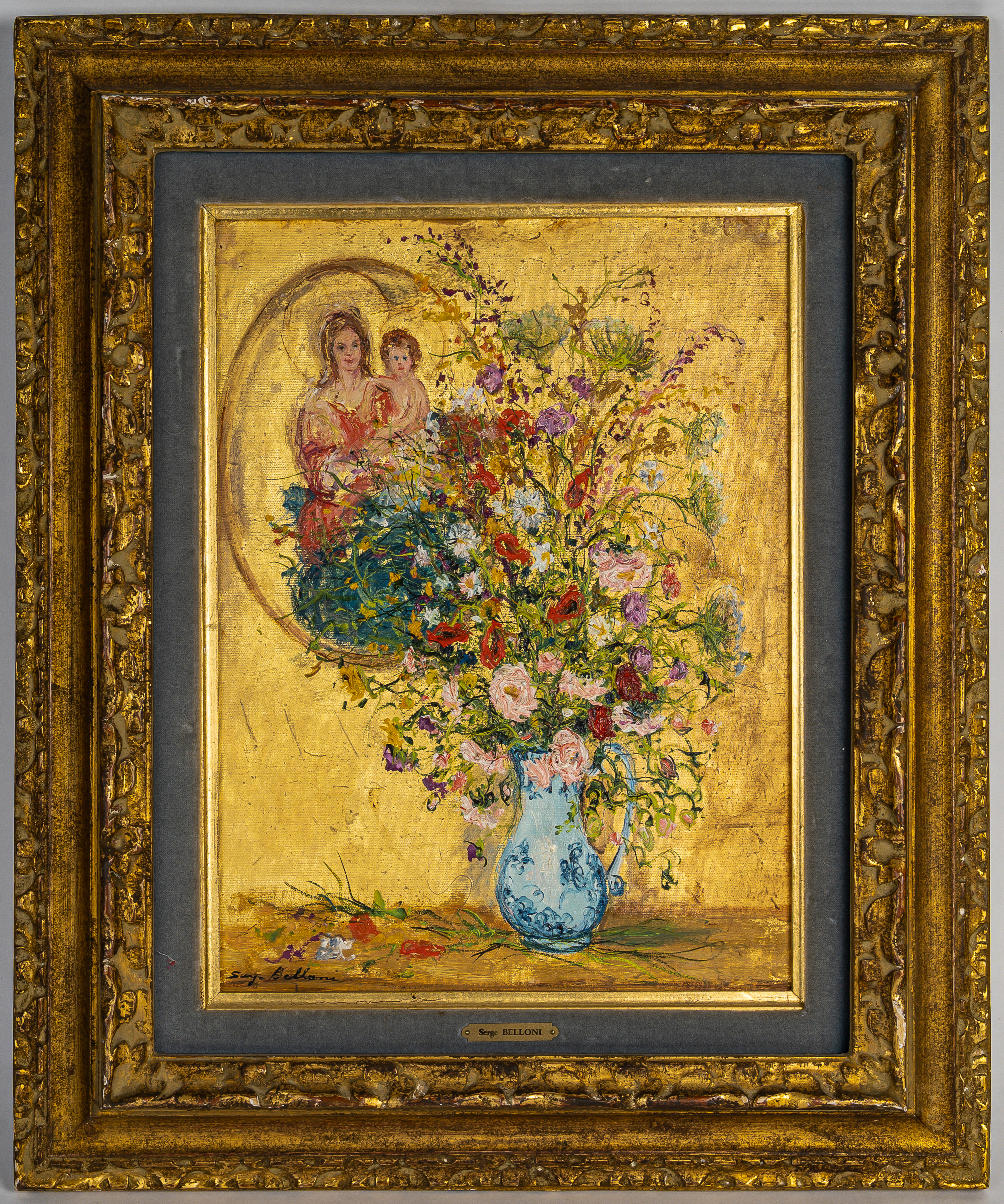 Serge Belloni (1925-2005) – Bouquet de Fleurs dans un Vase de Delft huile sur panneau vers 1970 Description : Serge Belloni, connu