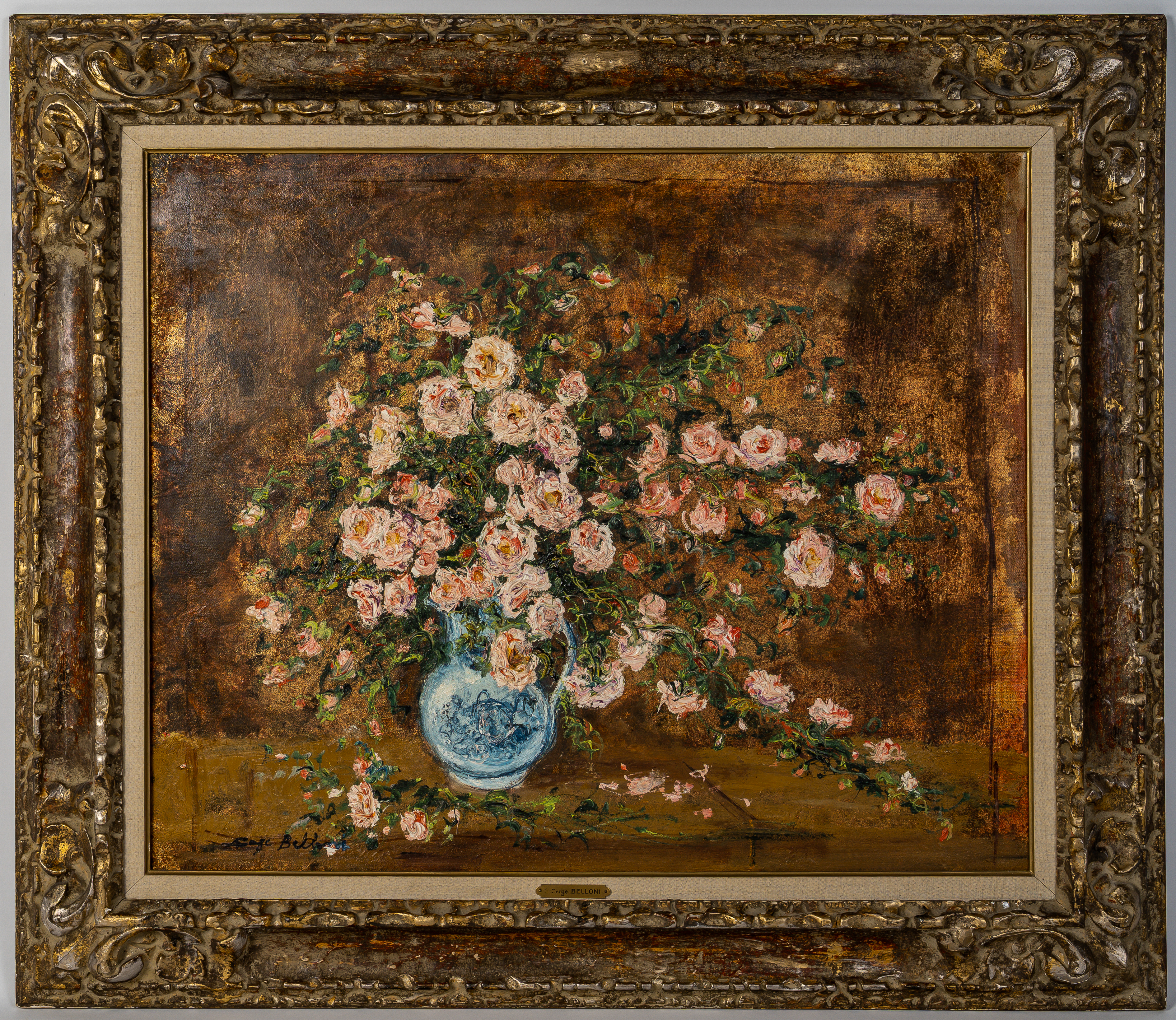 Serge Belloni (1925-2005) – Bouquet de Roses dans un Vase de Delft, huile sur toile vers 1970 Description : Serge Belloni, connu