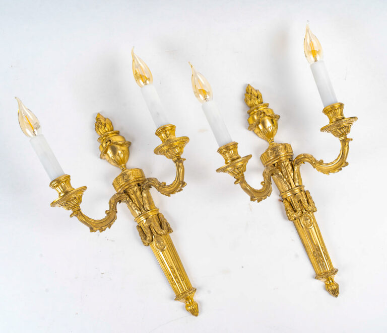 Paire d’Appliques de style Louis XVI en Bronze Ciselé et Doré à Deux Bras de Lumières vers 1820 Une élégante et décorative