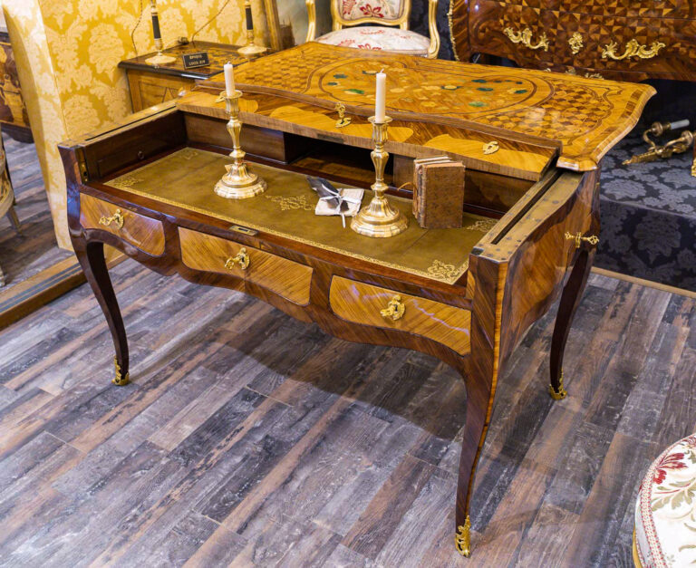 Jean-Baptiste Tuart et Grand Trianon – Important bureau mécanique à marqueterie florale, époque Louis XV Ce bureau mécanique à transformation, rare et