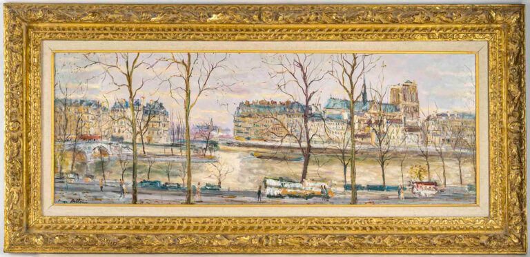 Serge Belloni (1925-2005) – Pont Louis Philippe, les Quais de Seine et Notre-Dame huile sur bois vers 1970 Description : Serge Belloni,
