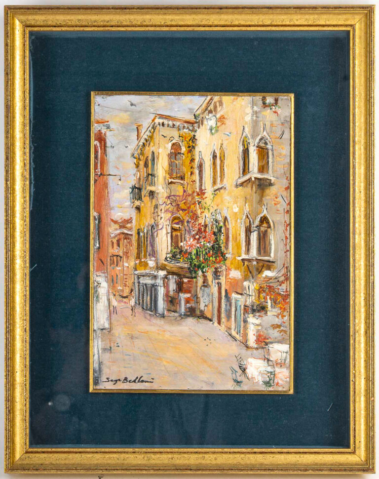 Serge Belloni (1925-2005) – Ruelle Fleurie de la Venise Authentique huile sur panneau vers 1980 Description : Serge Belloni, surnommé “Le Peintre