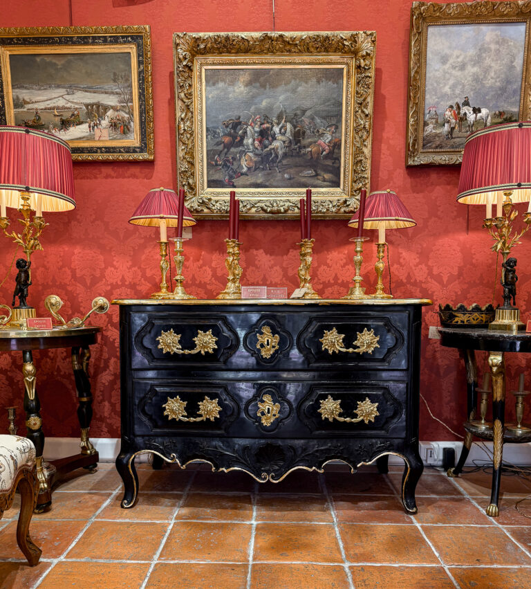 Commode Provençale d’époque Louis XV en noyer laqué sculpté d’une coquille et de branches d’olivier Cette commode galbée, dite sauteuse, allie élégance