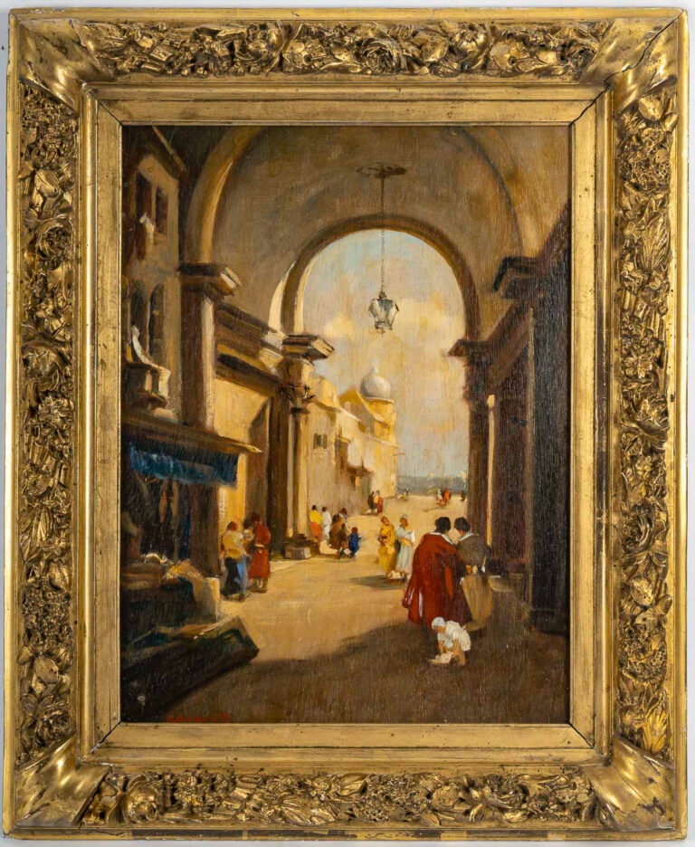 Attilio Achile Bozzato (1886-1954) Venise Cappricio avec l’Arche della Torre dell’Orologio huile sur bois Attilio Bozzato nous offre une interprétation captivante et