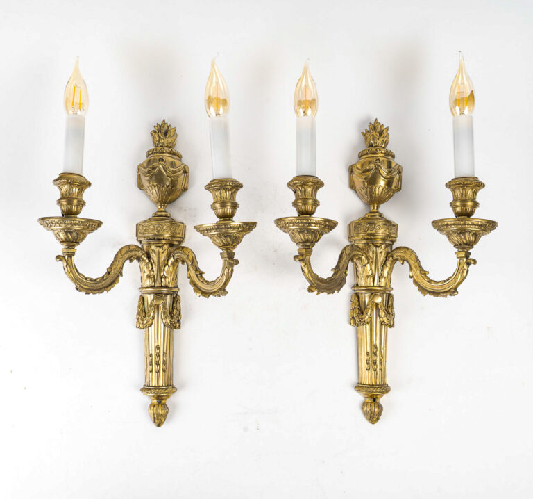 Paire d’Appliques en Bronze Ciselé à Deux Bras de Lumières de style Louis XVI Une élégante et décorative paire d’appliques à deux