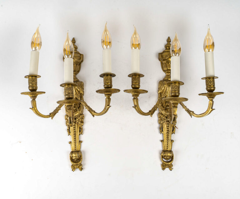 Paire d’Appliques en Bronze Ciselé à trois Bras de Lumières de style Louis XVI Une élégante et décorative paire d’appliques à trois