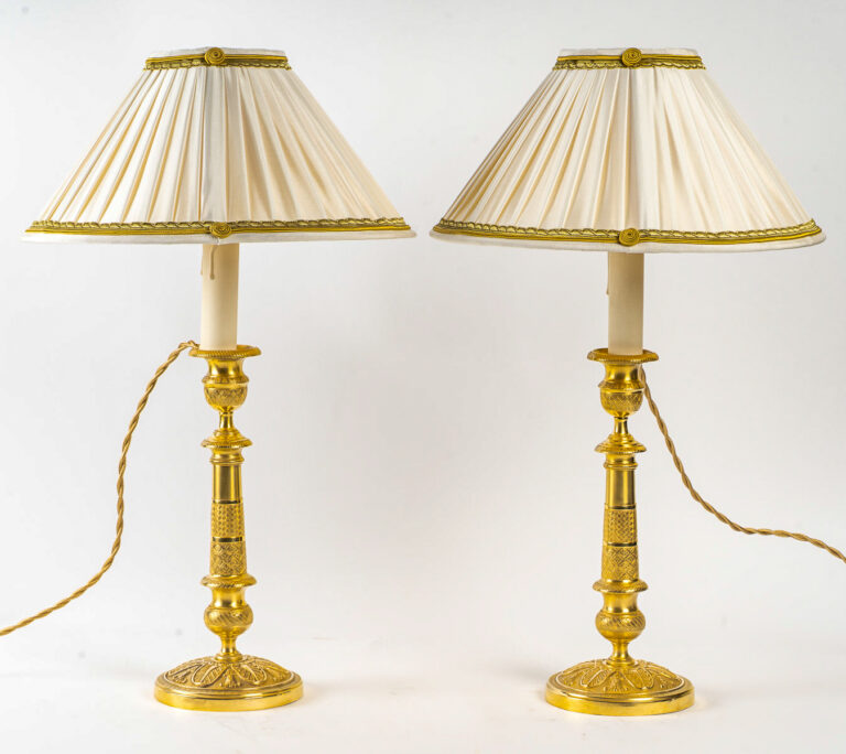 Paire de Flambeaux d’Époque Restauration en Bronze Ciselé et Doré Montée en Lampes vers 1820-1830 Cette belle et décorative paire de flambeaux
