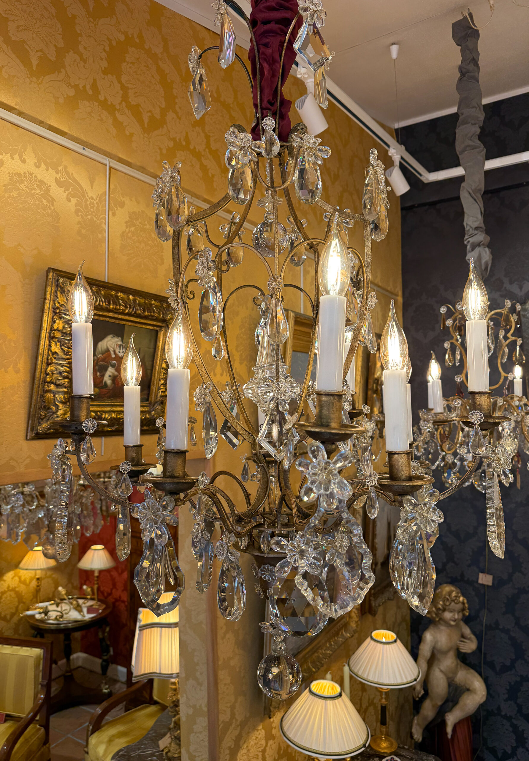 Lustre en Fer à Patine Dorée et Cristal Taillé par Maison Baguès, vers 1920 Ce lustre élégant, éclairant par dix bras de