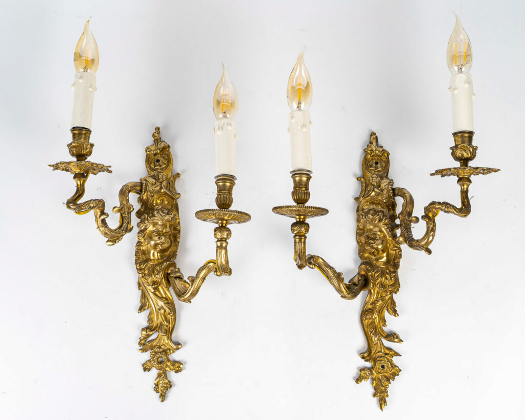 Inspirée d’un modèle iconique du célèbre bronzier Jean-Joseph de Saint-Germain, cette paire d’appliques de style Louis XV se distingue par ses deux bras de lumière en bronze ciselé et doré. L’agrafe est ornée d’une tête de Zéphyr soufflant, entourée de feuilles d’acanthe et de rinceaux feuillagés en chute.