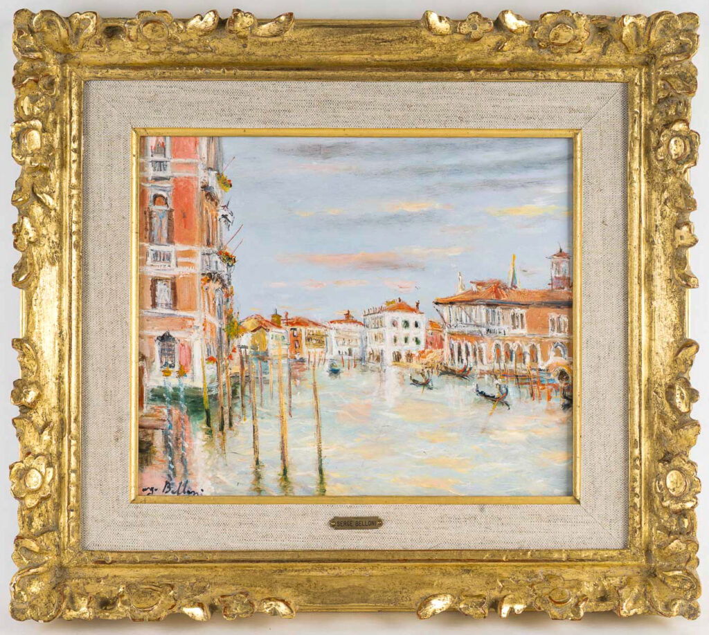 Ce charmant tableau nous transporte à Venise, avec une ravissante vue du Grand Canal à Venise. Belloni affectionnait passer l’automne et le début de l’hiver à Paris, où les arbres dénudés révélaient l’architecture et l’âme authentique de la ville. Et le reste de l’année à Venise pour y capturer cette lumière si particulière, la palette de couleur de ce beau tableau est apaisante et nous incite à le suivre dans son voyage et sa reverie.