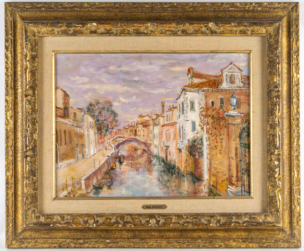 Ce charmant tableau nous transporte à Venise, avec une ravissante vue d’un petit Canal avec ses Ponts et suspendu le jardin du Poète dans la Venise cachée. Belloni affectionnait passer l’automne et le début de l’hiver à Paris, où les arbres dénudés révélaient l’architecture et l’âme authentique de la ville. Et le reste de l’année à Venise pour y capturer cette lumière si particulière, la palette de couleur de ce beau tableau est apaisante et nous incite à le suivre dans son voyage et sa reverie.